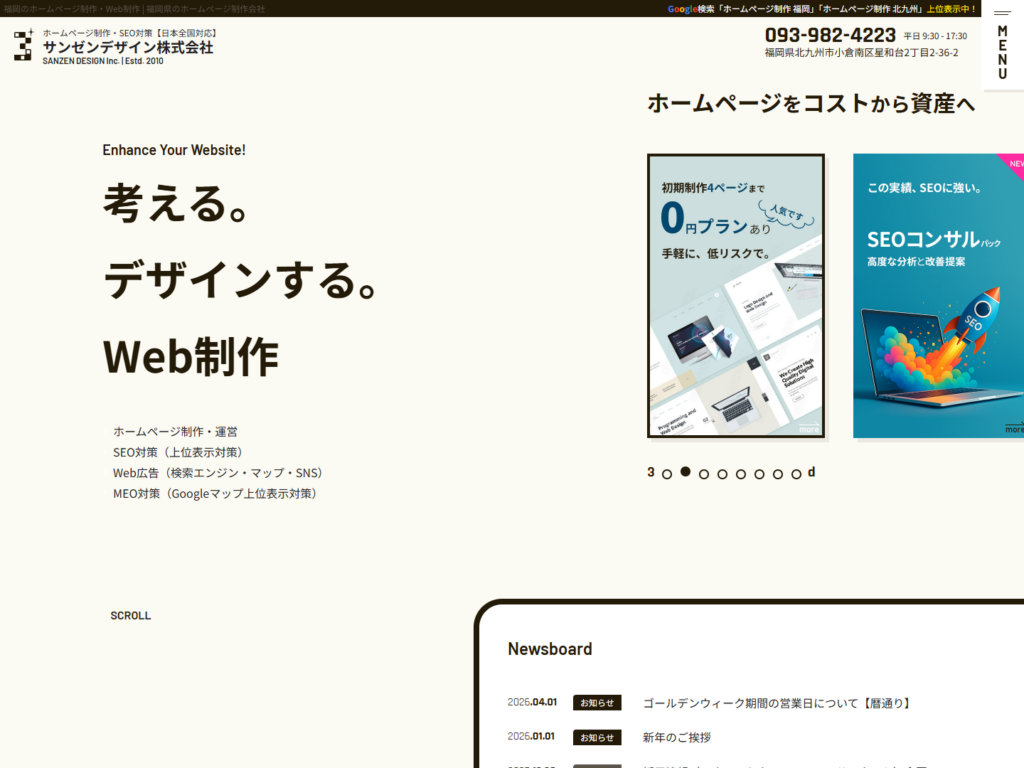 サンゼンデザイン株式会社は、北九州市小倉南区に拠点を置く制作会社で、地元商圏を意識したSEOとMEOをまとめて相談したい企業に向く一社です。自社サイトで上位表示を狙い続けてきた運用経験をもとに、ホームページ制作から改善提案までつなげやすい体制が整っています。