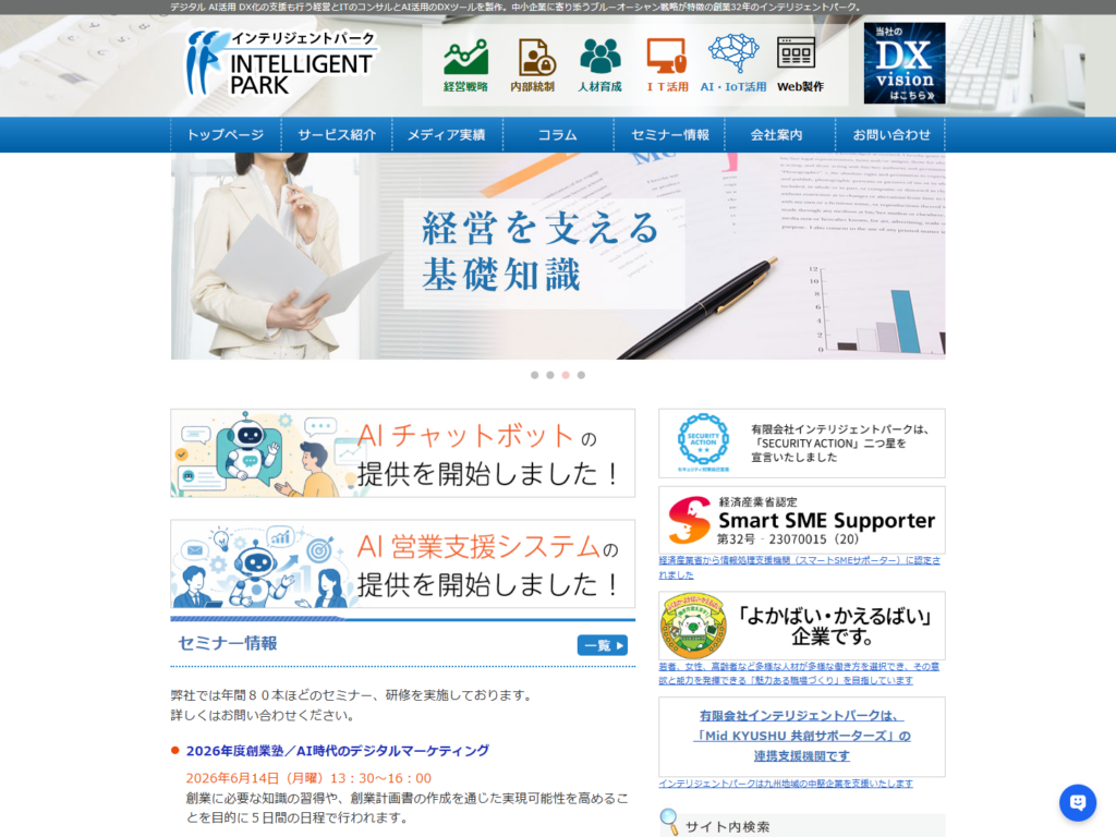 有限会社インテリジェントパークは、北九州市小倉北区の独立系コンサルティングファームで、SEOを経営課題やIT活用とあわせて考えたい企業に向いています。Web担当者が社内にいない企業でも、改善提案や研修まで含めて相談しやすい点が特長です。