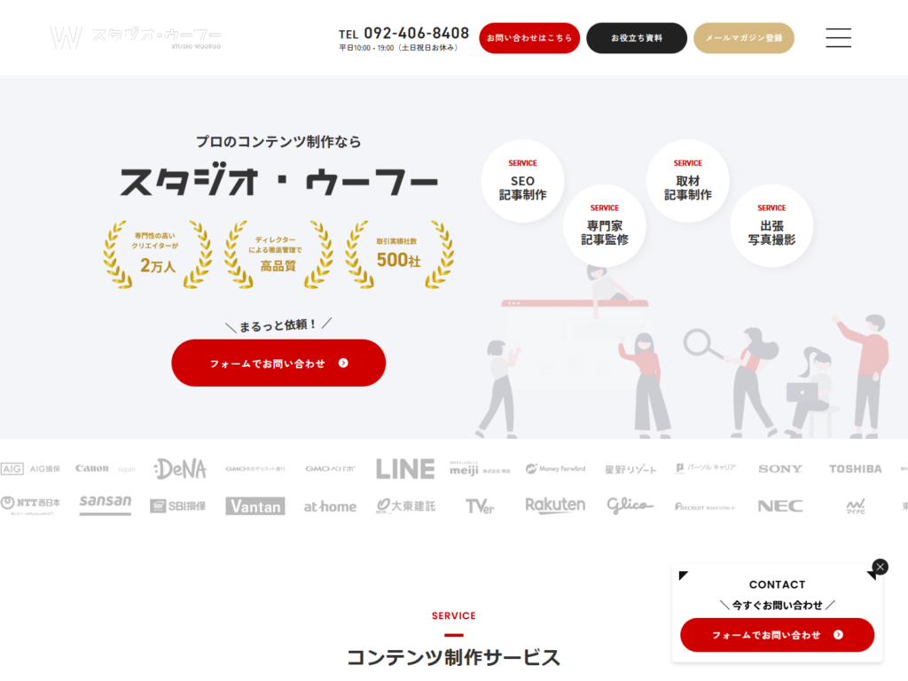 株式会社スタジオ・ウーフーはコンテンツ制作に特化した会社で、記事品質を重視するコンテンツSEOとの相性が高い会社です。SEO記事だけでなく、取材、専門家監修、写真、動画まで同時に動かせるため、E-E-A-Tを意識した情報発信を強化しやすくなります。
