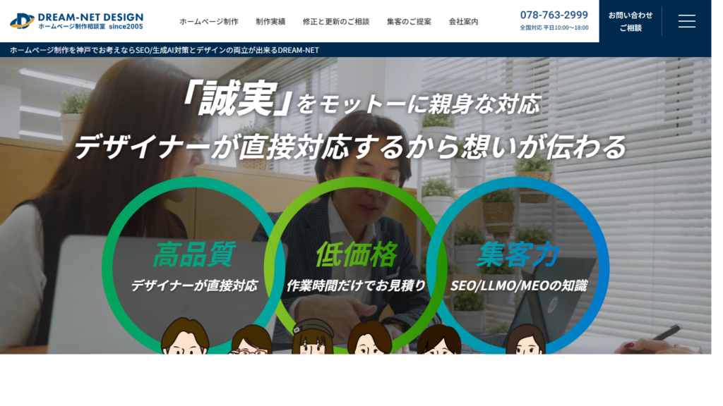 | ドリームネットデザイン株式会社 | 神戸市東灘区 | ホームページ運用コンサルタント、SEOレポート提出、ホームページ保守、システム保守 | ホームページ運用コンサルタント 月額55,000円〜 | 要問い合わせ | デザイナーが直接対応し、WEB解析の専門家と連携 |