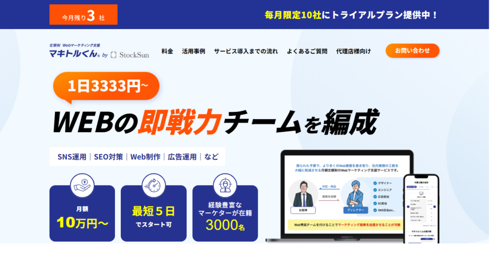 | マキトルくん | 要問い合わせ | コンテンツ作成、SEO全般、Webサイト運用、広告運用、SNS運用、LINE運用、サイト解析 | 月5万円〜 | 要問い合わせ | 実績あるパートナーが担当し、経験豊富なマーケター3000名が在籍 |