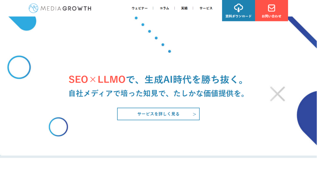 | 株式会社メディアグロース | 東京都新宿区 | SEO支援 | 要問い合わせ | 要問い合わせ | 月間1億PV規模のサイト支援実績や売上300%アップの実績あり |