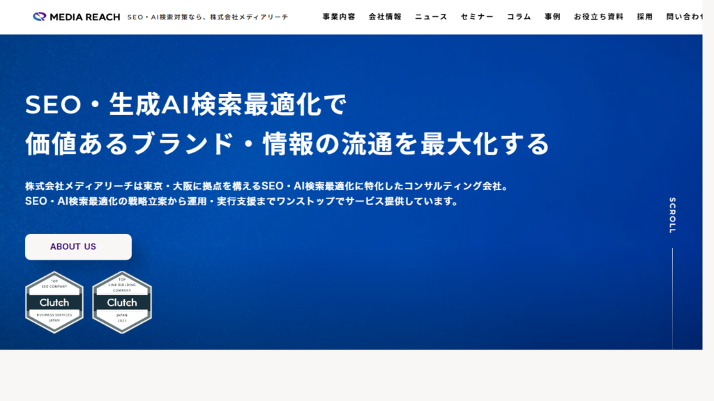 | 株式会社メディアリーチ | 大阪市北区 | SEOサイト診断、SEOコンサルティング、SEO研修、被リンク獲得代行、SEO記事制作、SEO内製化支援 | SEOコンサルティング 月額10万円〜/被リンク獲得代行 月額7万円〜 | 6ヶ月〜 | データベース型サイトや海外SEOにも強い |