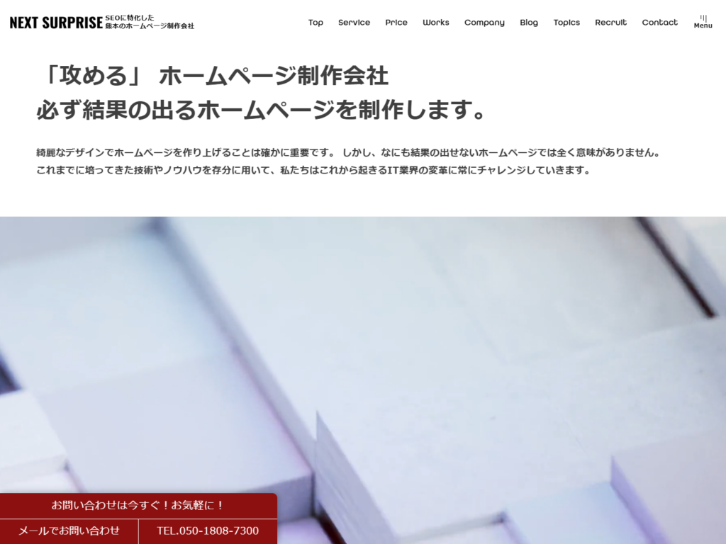 | 15 | NEXT SURPRISE | 実績が豊富 | 熊本県上益城郡山都町入佐801-2 | 広告代理店を介さず低価格と高品質を両立するWeb制作とSEO支援 | 費用感を抑えつつ攻めたデザインとSEOを両立したい企業なら候補に入れやすい一社です。 |