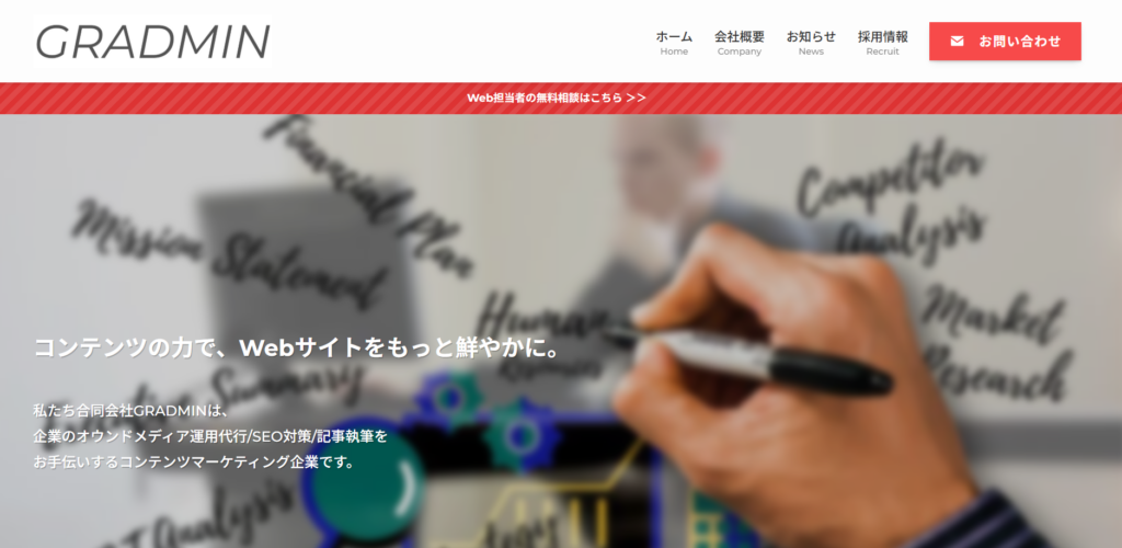 合同会社GRADMINは、オウンドメディア運用代行まで含めて伴走するコンテンツマーケ支援を軸に、オウンドメディア運用代行とSEO記事作成まで視野に入れた支援設計が特徴です。