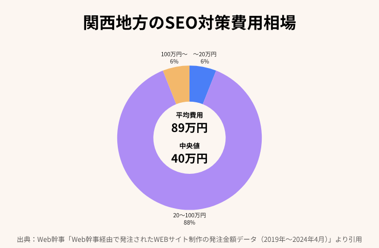 Web幹事のマッチングサービス経由で発注された関西地方のSEO対策データによると、平均費用は55.8万円(中央値41.9万円)となっています。