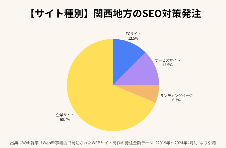 関西地方のSEO対策における発注サイト種別では、企業サイト(コーポレートサイト)が約68.8%を占めています。