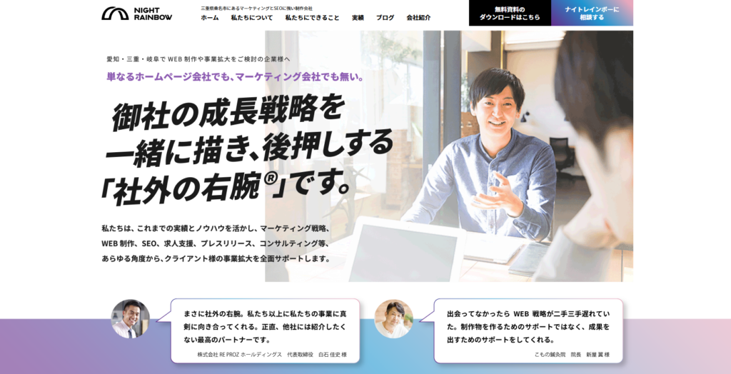 | 4 | 株式会社ナイトレインボー | 豊富な実績 | 三重県桑名市南魚町51番地 | 幅広いキーワードで検索順位1位を獲得 | 見積もり制 | SEO対策を本格的に始めたい企業 |