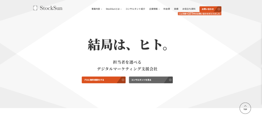 | 6 | StockSun株式会社 | 豊富な実績 | 公式サイトよりお問い合わせください | SEOコンサルティングの専門知識を活かした戦略提案 | 公式サイトよりお問い合わせください | SEO対策を本格的に始めたい企業 |