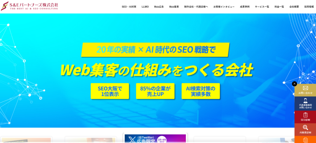 | 8 | S&Eパートナーズ株式会社 | 豊富な実績 | 公式サイトよりお問い合わせください | SEO対策の実践的なノウハウに基づく改善施策 | 公式サイトよりお問い合わせください | SEO対策を本格的に始めたい企業 |