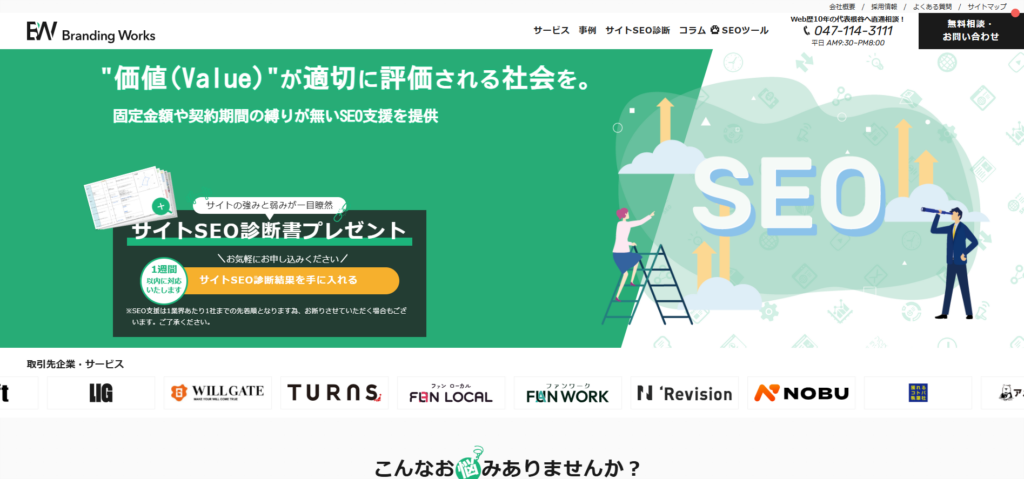 | 13 | 株式会社ブランディングワークス | 豊富な実績 | 千葉県柏市若柴178番地4 柏の葉キャン… | 10年以上のSEOコンサルティング実績 | SEOコンサル:1.5万〜200万円 記事作成:5.5万〜 | SEO対策を本格的に始めたい企業 |