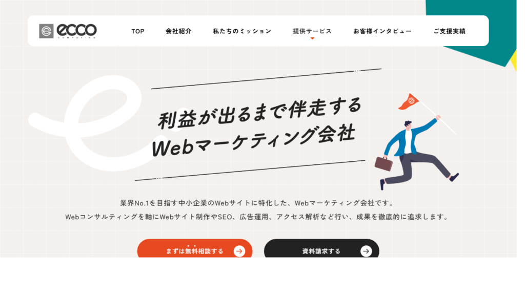 | 株式会社エッコ | 〒460-0008 愛知県名古屋市中区栄3-18-1 ナディアパークビジネスセンタービル12階 | 費用感を比較しながら相談しやすい | コンサルティングサービス ライトプラン:月15万円 スタンダードプラン:月25万円 エキスパートプラン:月40万円 |