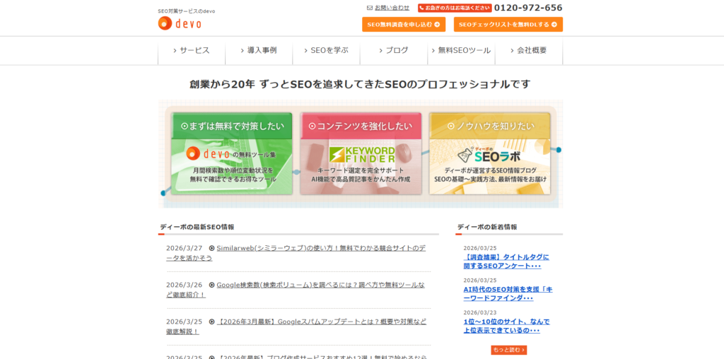 株式会社ディーボは、SEO業界初の順位変動チェックツール「namaz.jp」の開発元として知られ、ツール開発力の高さが特徴です。