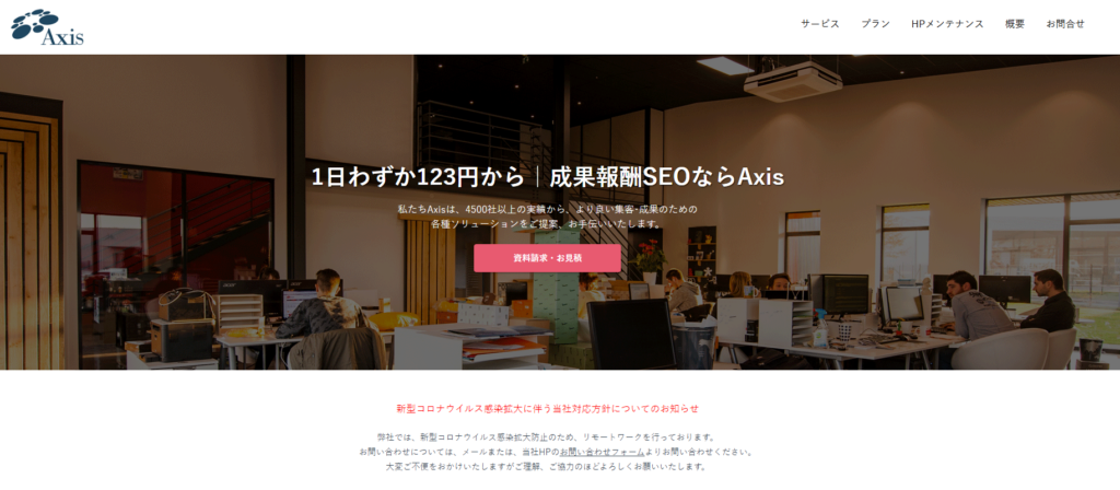 株式会社Axisは、月額123円という圧倒的な低コストからSEO対策を始められる成果報酬型プランを提供しています。