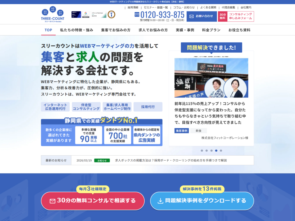 スリーカウント株式会社は、静岡県浜松市中央区に拠点を置く会社です。SEO対策、MEO対策、広告運用、リスティング広告などに対応しており、DXやデータ活用まで含めて相談したい企業に向いています。