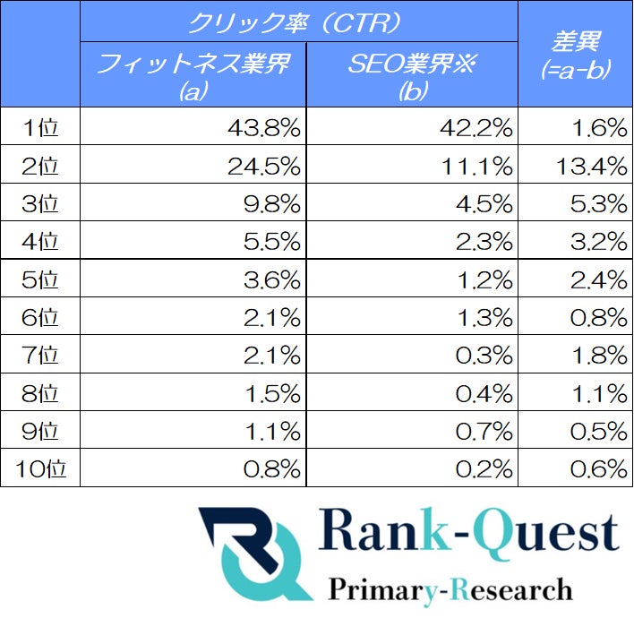 本調査では、検索結果の上位10位に入っている3,656件のフィットネス関連キーワードを対象に、順位ごとのCTR変動を徹底分析。さらに、ランクエストが運用するSEO業界向けメディア(注2)のクリック率データと比較することでフィットネス業界に特化したクリック傾向を明らかにしています。