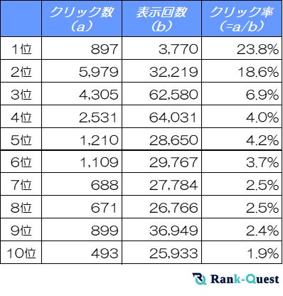 3位のCTRは約7%で、上位2位に比べると一気に数字が落ちています。4位以下も数%前後で推移しており、10位では1.9%まで低下しています。