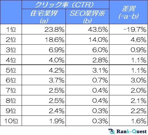 本調査では、検索結果の上位10位に入っている5,442件の住宅関連キーワードを対象に、順位ごとのCTR変動を徹底分析。さらに、ランクエストが運用するSEO業界向けメディアのクリック率データと比較することで、住宅業界に特化したクリック傾向を明らかにしています。