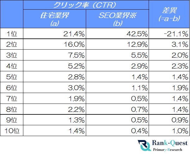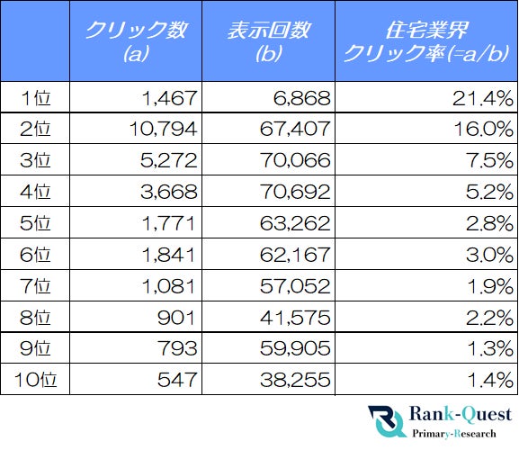 【SEO対策】で検索結果1位(注1)を獲得したランクエスト(https://rank-quest.jp/column/column/how-to-seo/ )は、2025年3月に住宅業界のクライアントサイトを対象とし「検索順位ごとのクリック率(CTR)」の調査を実施しました。