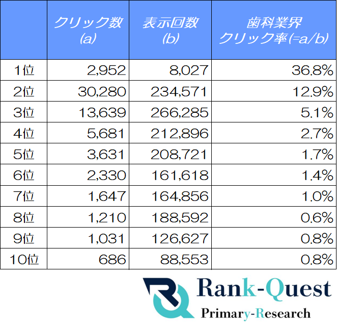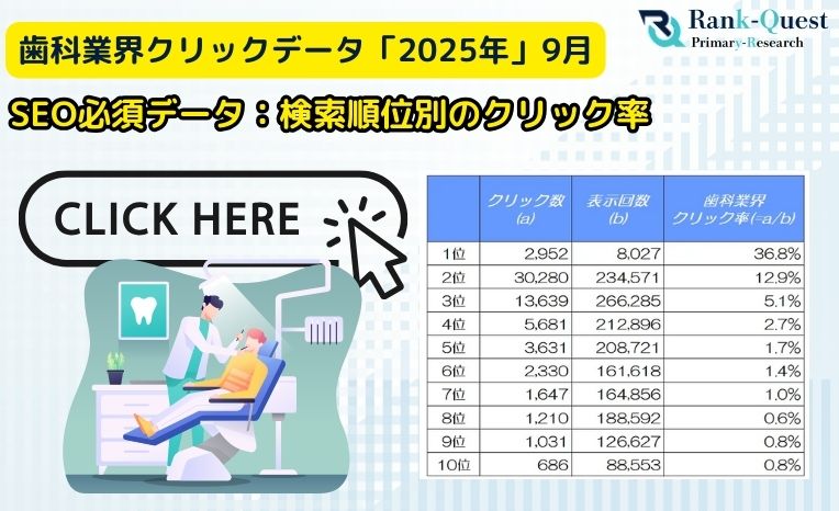 累計4,300社以上のSEO支援実績を持つランクエスト(https://rank-quest.jp/column/column/how-to-seo/ )では、2025年9月に歯科分野のクライアントサイトを対象とした調査を実施しました。本調査では、検索結果の1位〜10位に表示された7,091件の歯科関連キーワードを抽出し、順位別のクリック率(CTR)を詳細に検証しています。