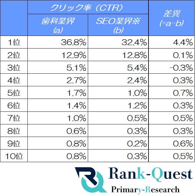 実際に、9位では歯科業界0.8%に対しSEO業界0.2%、10位でも歯科業界0.8%に対しSEO業界0.3%と、下位順位においても差が見られます。