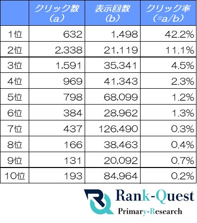 対象キーワードは、2025年5月中にランクエストサイトで検索結果1位から10位に掲載されたものに限定し、各順位ごとのクリック率を分析しました。