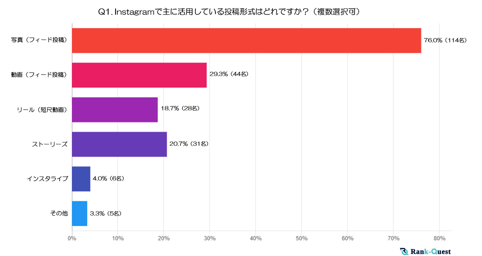 最も多かった回答は「写真(フィード投稿)」で、全体の76%という高い割合を占めました。次いで「動画(フィード投稿)」が29.3%となっており、写真中心のInstagramとはいえ、動画投稿も一定の支持を集めていることがわかります。