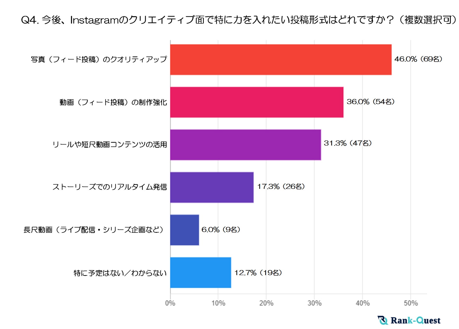 最も多かった回答は「写真(フィード投稿)のクオリティアップ」で、全体の46%を占めています。Instagramの特性上、やはり写真のビジュアル品質をさらに向上させたいと考える方が多い印象です。