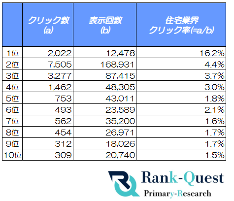 本調査では、検索結果の1位〜10位に表示された住宅関連キーワードを抽出し、順位ごとのCTRの推移を詳しく検証しています。