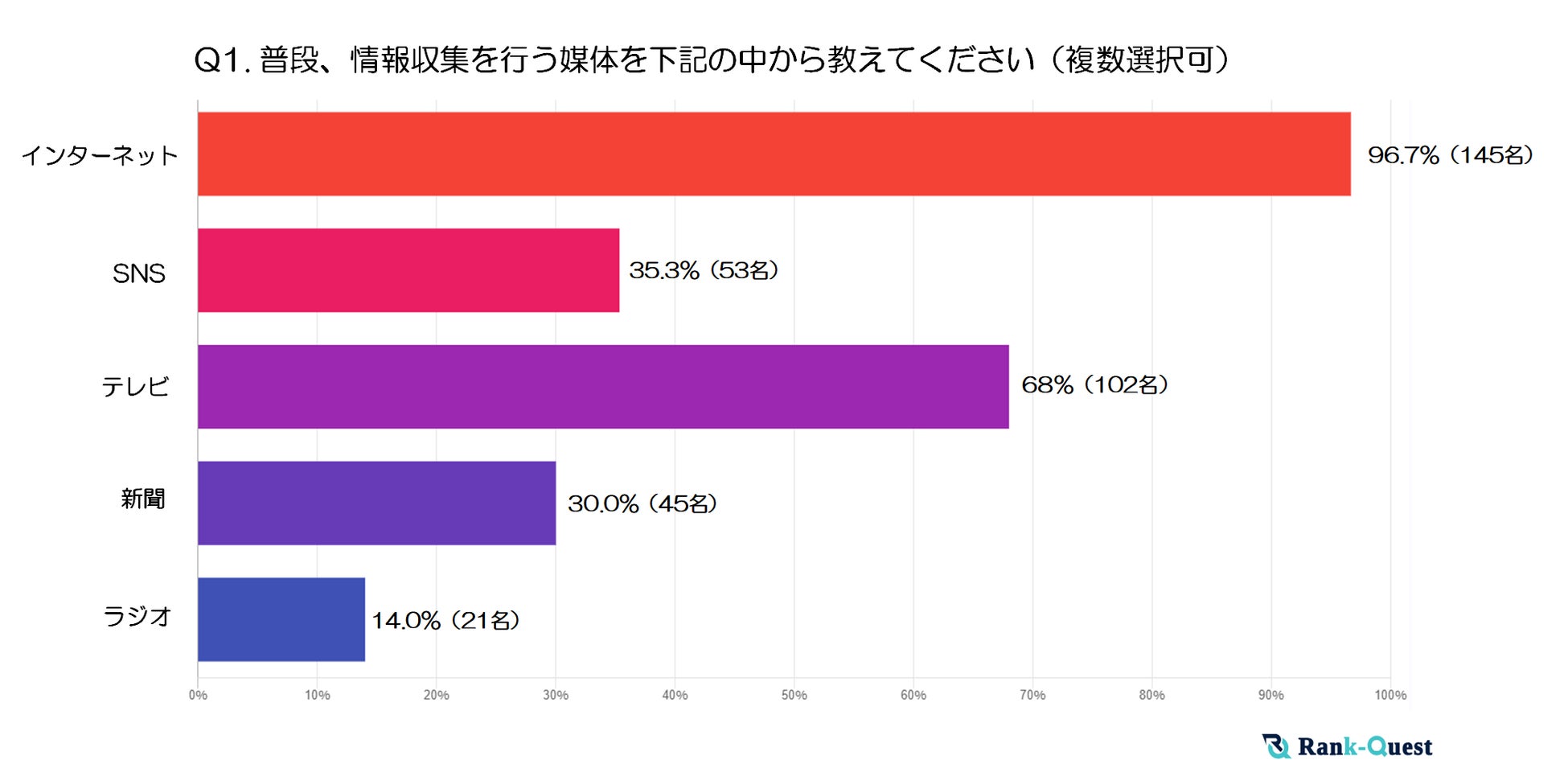 最も回答が多かったのは「インターネット」で、96.7%と圧倒的な利用率を示しました。