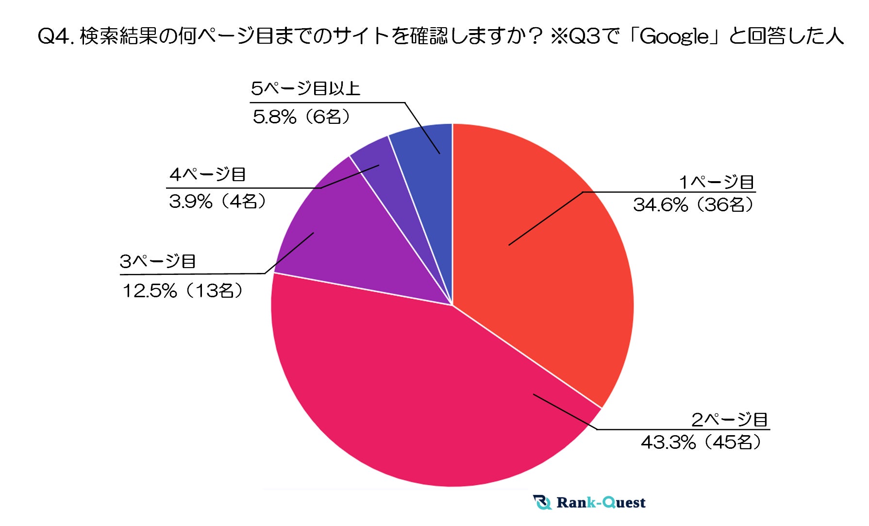 これに次いで「1ページ目のみ確認する」という回答が34.6%と高く、全体の約80%が検索結果の2ページ目以内で情報を探す傾向があることが明らかになりました。