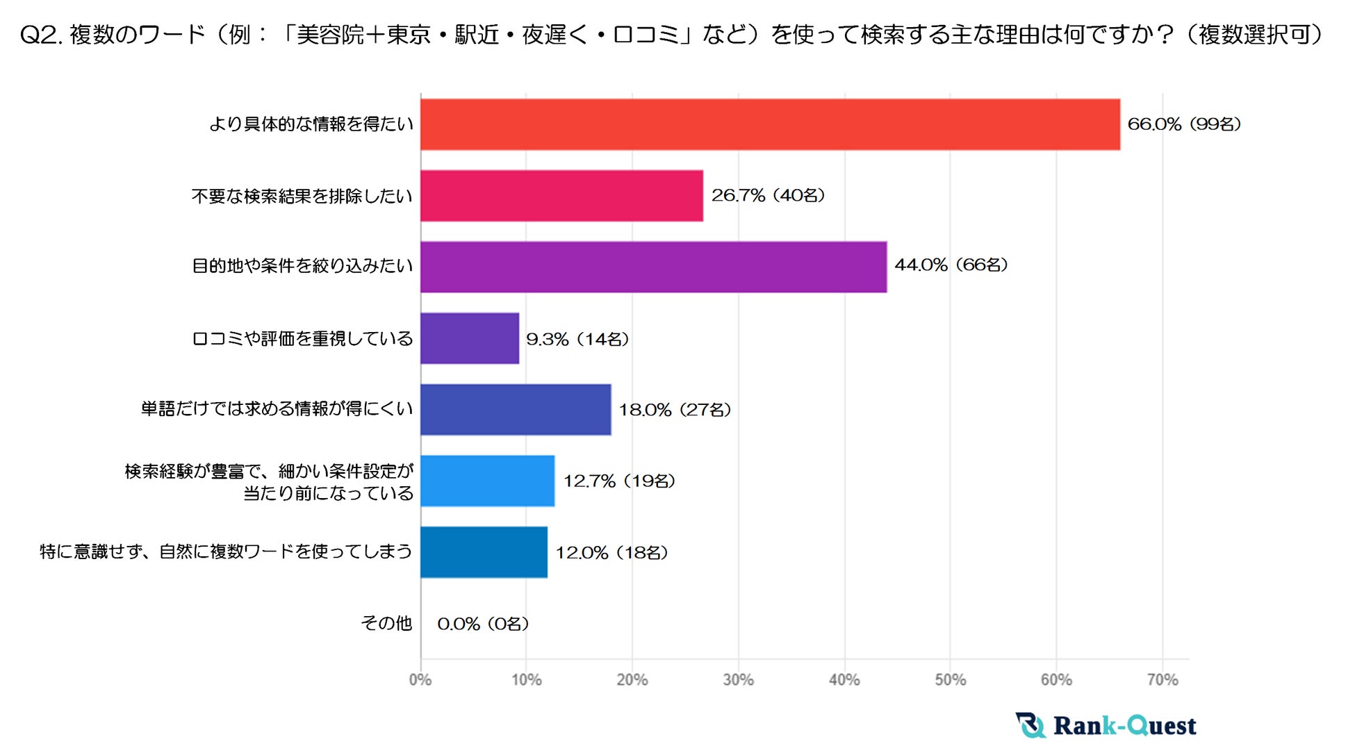 最も多かった回答は「より具体的な情報を得たい」(66%)でした。続いて「目的地や条件を絞り込みたい」(44%)、「不要な検索結果を排除したい」(26.7%)が上位に挙がっています。