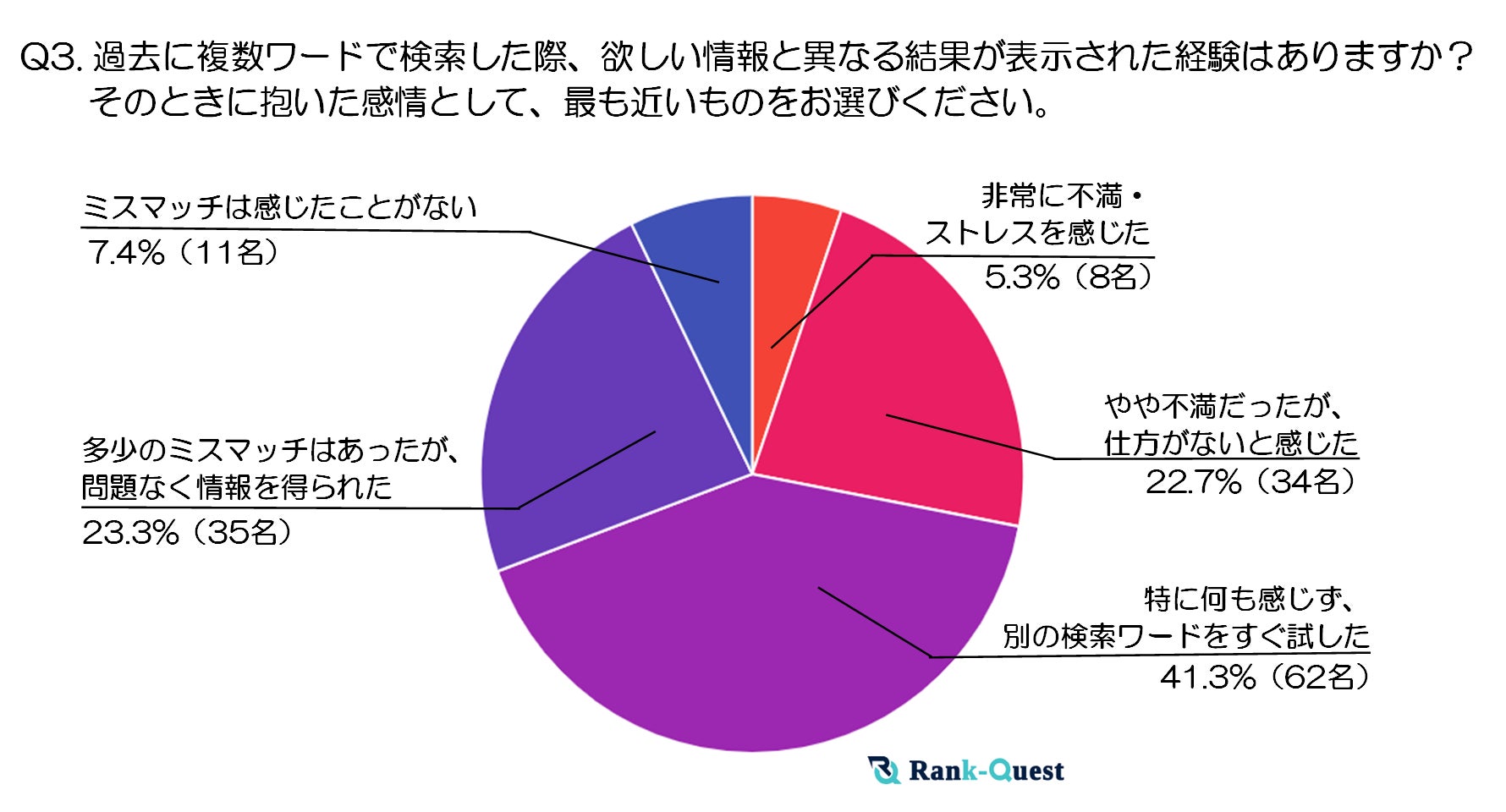 調査結果➂:過去に複数ワードで検索した際、欲しい情報と異なる結果が表示された経験はありますか? そのときに抱いた感情として、最も近いものをお選びください。