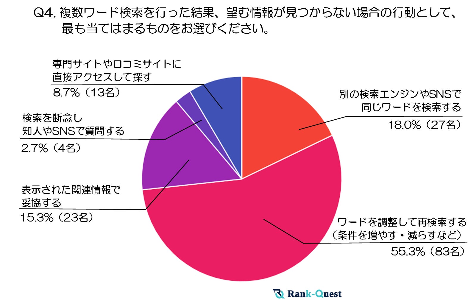 最も多かった回答は「ワードを調整して再検索する(条件を増やす・減らすなど)」(55.3%)で、半数以上がキーワードを見直して粘り強く検索を続ける傾向がうかがえます。
