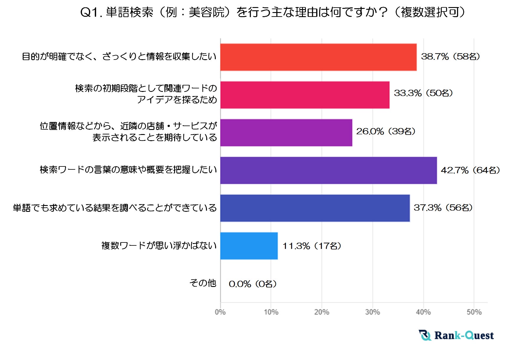 これらの疑問を明らかにするため、2025年2月12日に【SEO対策】で検索順位No.1を獲得した(注1)ランクエスト(https://rank-quest.jp/column/column/how-to-seo/ )は、70代以上の男女150名を対象に「単語検索vs.複数ワード検索の実態」に関する独自調査を実施しました。この調査では70代以上の検索行動について以下の4点を多角的に分析しました。