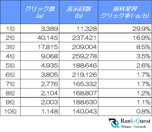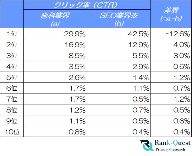 さらに、SEO業界向けのランクエストサイトにおけるクリック率データと比較することで歯科関連サイト特有のクリック傾向を明らかにしました。