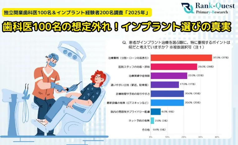 そこで、SEO会社のランクエスト(https://rank-quest.jp/column/column/how-to-seo/ )は、インプラント治療を提供している独立開業歯科医師100名と、実際にインプラント治療を経験した患者200名を対象に、『インプラント治療の医院選びで決め手となったポイント』に関する調査を実施しました。