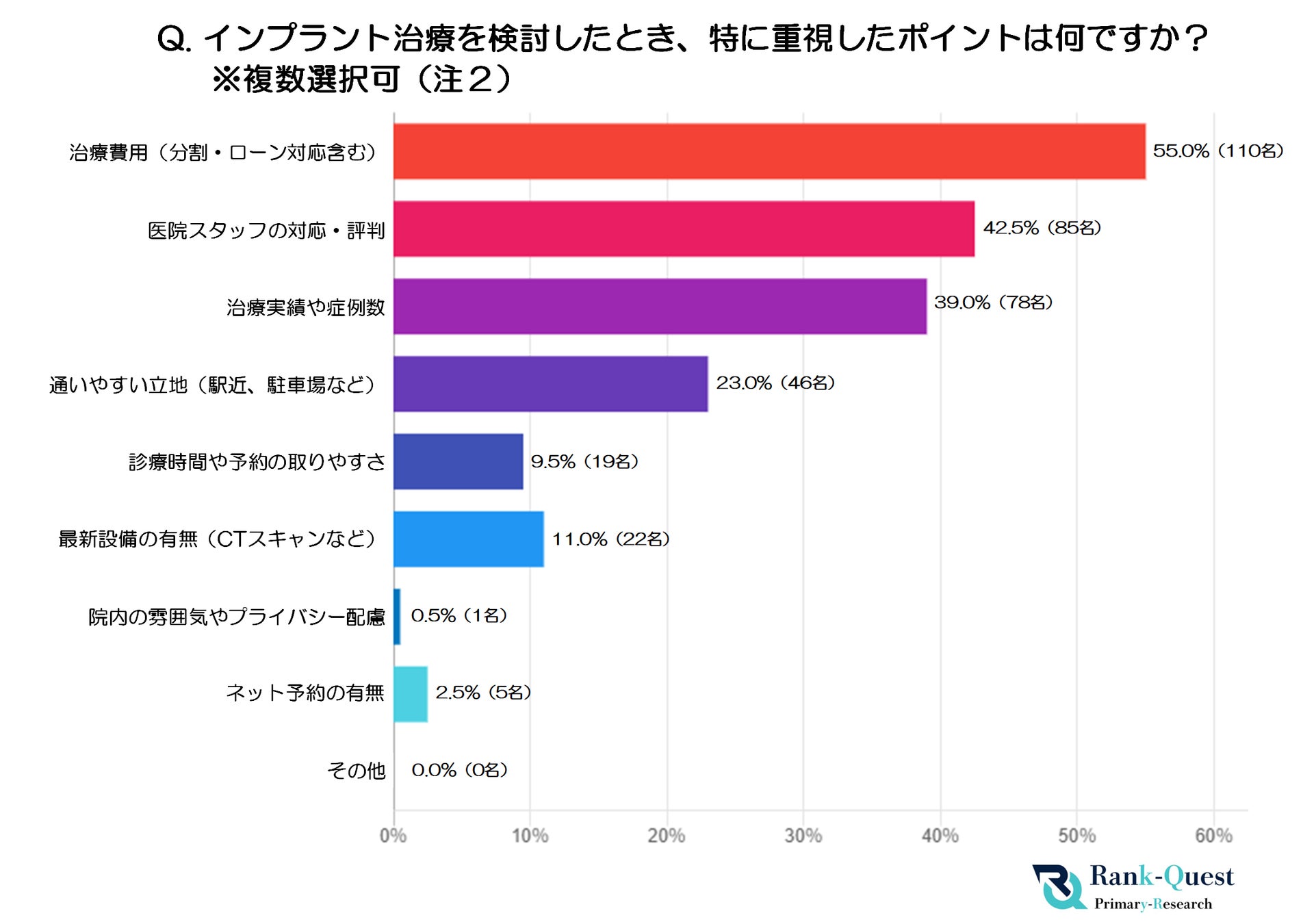 1位は圧倒的に費用面。「高い」と言われるインプラント治療に対し費用負担がどれくらいになるのか、支払い方法(分割やローン等)が整っているかを重視する方が多いという結果です。