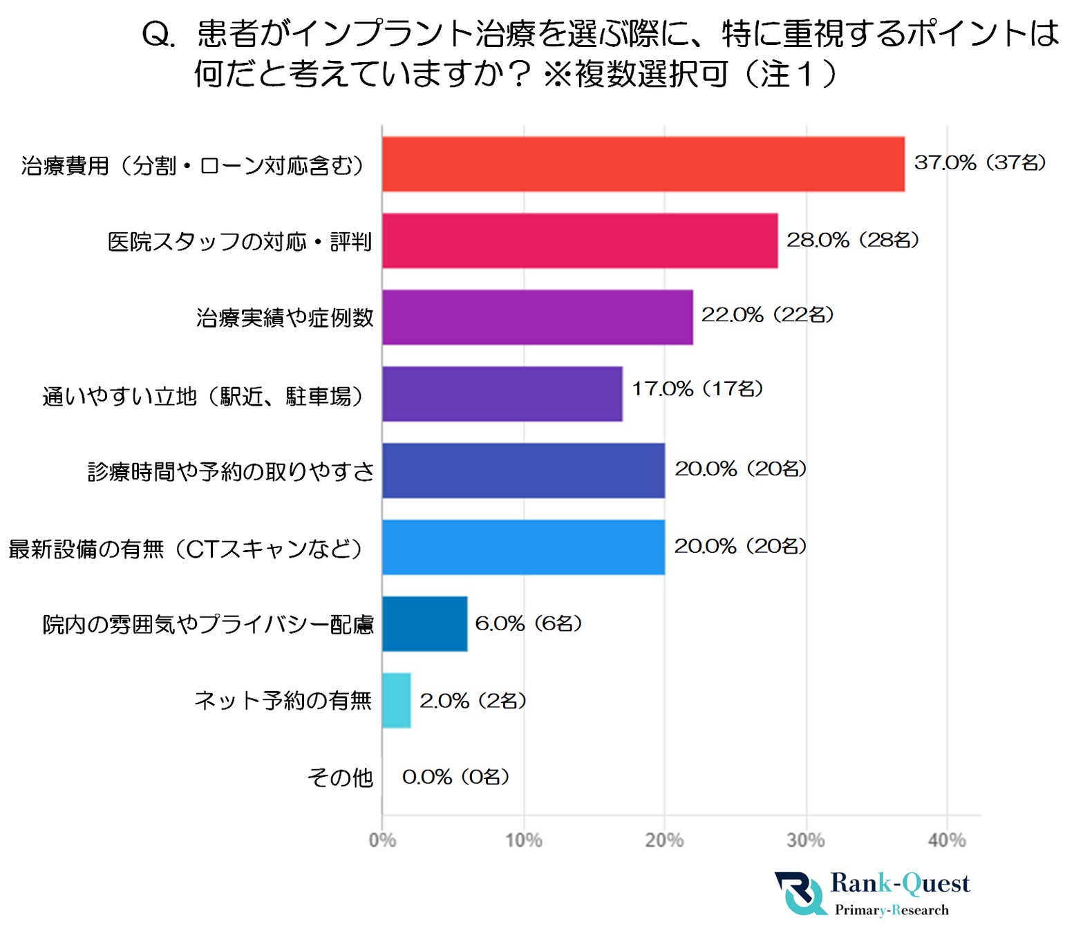 全国のインプラント治療を提供する独立開業歯科医師100名を対象に「患者がインプラント治療を選ぶ際、特に重視していると考えているポイント」についてアンケートを実施しました。その結果、上位に挙げられたポイントは以下の3つでした。