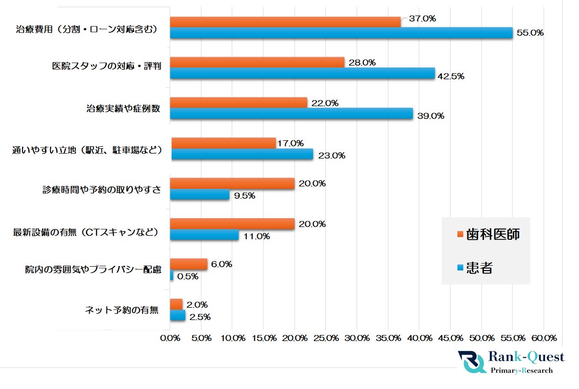 - 患者が費用を重視する割合(55%)は、歯科医師の認識(37%)を大きく上回っています。歯科医師側が考える以上に、患者にとって治療に掛かる費用や、コストの分散が出来ることは、高額な治療がゆえに医院選びの最重要ポイントになっています。