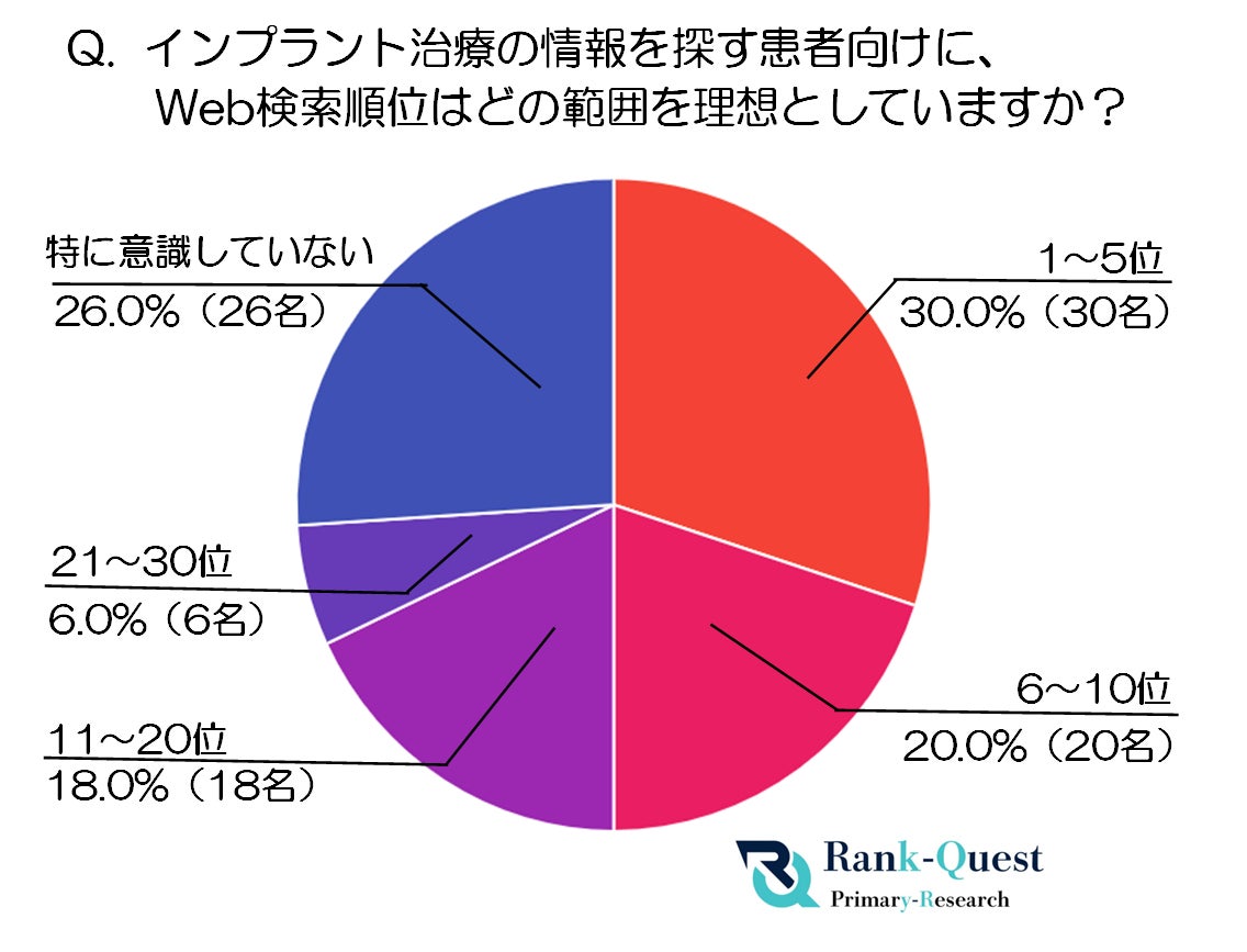 - 一見すると“上位”を意識しているように見えますが、細かく見るとトップ5位を狙う医院は30%に過ぎず、4人に1人(26%)は順位をそもそも気にしていないのが実情です。