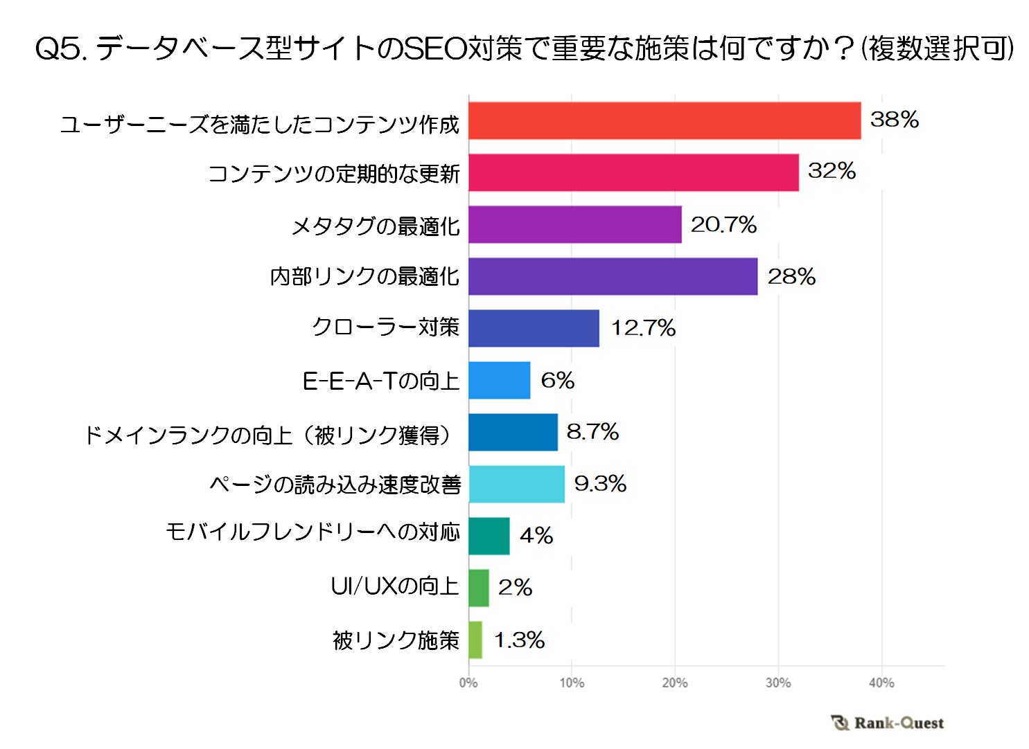 この結果から、データベース型サイトのSEO対策では、コンテンツ作成や更新、内部リンクの最適化といった基本的な施策が特に重視されていることが分かります。