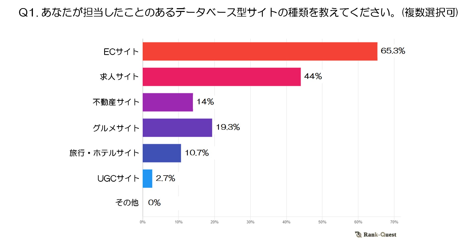 最も回答が多かったのはECサイトで65.3%が担当経験を持っています。次いで求人サイトが44%となっており、これら2つのサイトがデータベース型サイトの主流であることが分かります。