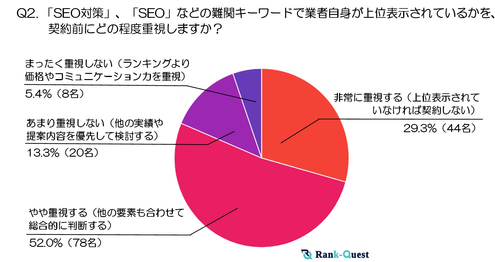 最も多かった回答は「やや重視する(他の要素も合わせて総合的に判断する)」で52%(78名)、これに「非常に重視する(上位表示されていなければ契約しない)」が29.3%(44名)と続きます。合わせると8割を超える回答者が「SEO対策」・「SEO」のような競合の激しいキーワードで上位表示されているかどうかを重視していることがわかります。