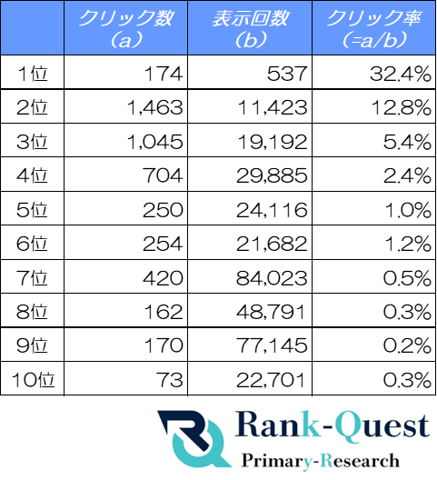 6位以下ではクリック率が1%未満に落ち込み、10位では0.3%程度にとどまっています。