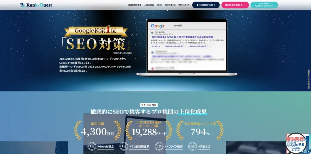 狙ったキーワードでクライアントのWebサイトを上位表示させるだけでなく、売上増大まで伴走するのがランクエストのSEOです。